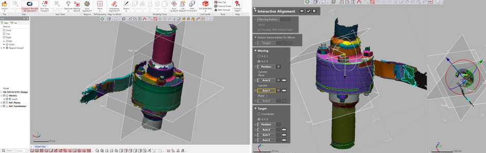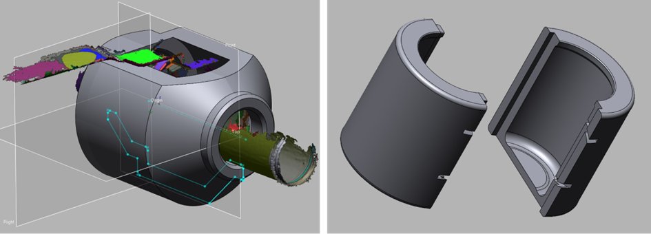 Si le projet est validé, Neil prend les mesures nécessaires à l’aide d’un pied à coulisse numérique ou d’un scanner 3D. Il importe ensuite les numérisations dans Geomagic Design X, où il conçoit le bouclier en l’adaptant au composant. Il définit les zones et aligne les plans de référence avant de créer un modèle qui entoure la zone à protéger. Il prévoit également la découpe du composant en plusieurs pièces distinctes, facilitant ainsi son assemblage sur place.