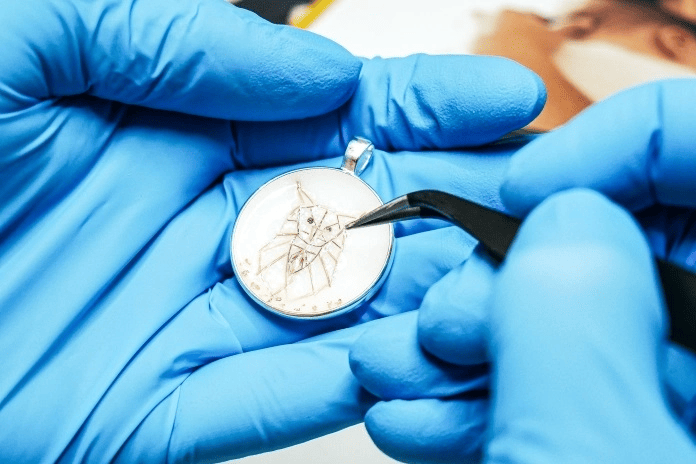 Après quoi le designer prend la monture moulée finale et y insère le matériau naturel. Il peut s’agir d’une mèche de cheveux utilisée pour graver des initiales sur une pierre précieuse, ou de lait maternel bouilli et mélangé à de la résine époxy pour qu’il durcisse et prenne la forme souhaitée, ou une empreinte digitale gravée dans la monture.